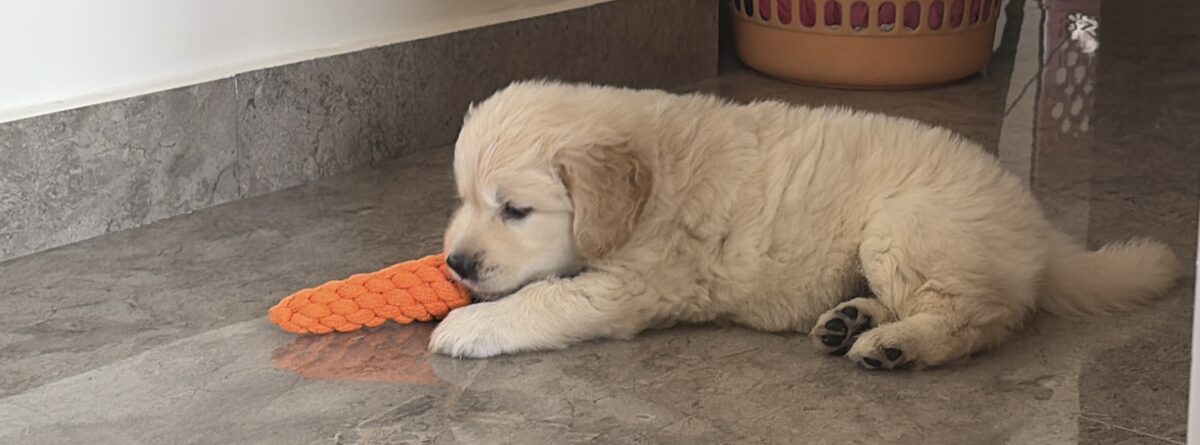 Adorable 9-week-old Golden Retriever puppy looking for a loving and caring home. The puppy is very playful, friendly, and active, with a sweet and gentle nature.